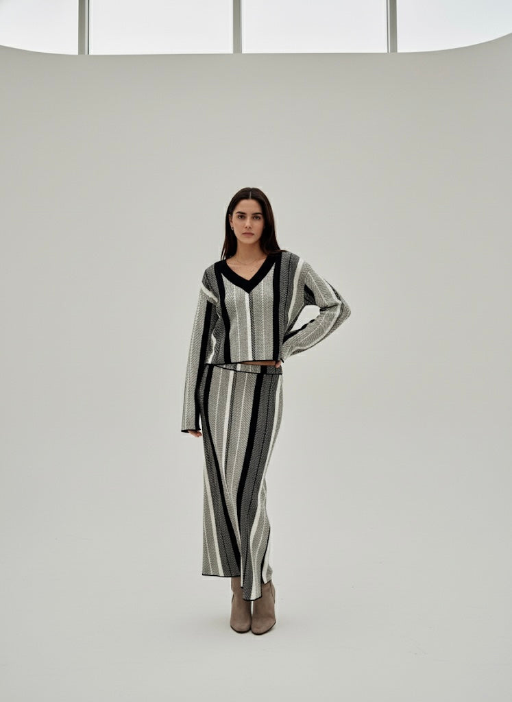El set de falda y chompa tejida en hilo de algodón (Beige con Negro). Úsalos juntos o separados.
